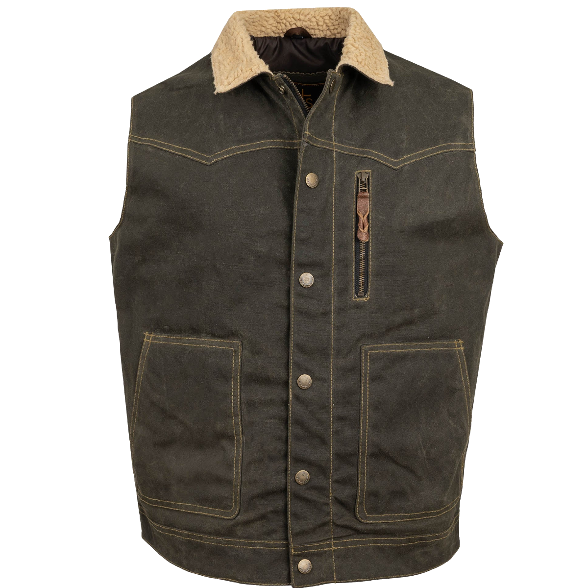 Built for work and designed for movement, this broken twill canvas vest keeps your core warm without slowing you down. Crafted from 100% cotton waxed canvas, it features a cozy plaid liner and a sherpa collar for added comfort. A double zip and snap-front closure locks in warmth, while multiple pockets—including hand-warming exterior pockets, a zippered chest pocket, and a concealed carry pocket—keep essentials close at hand. Tough enough for the jobsite, stylish enough for every day, this vest is the perfect blend of function and rugged western appeal.