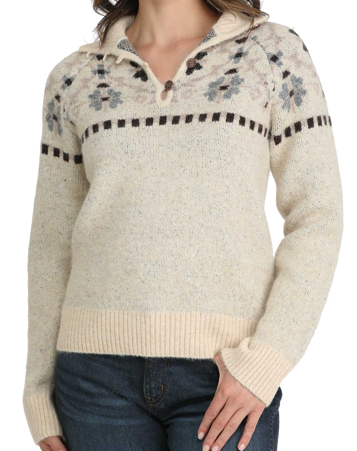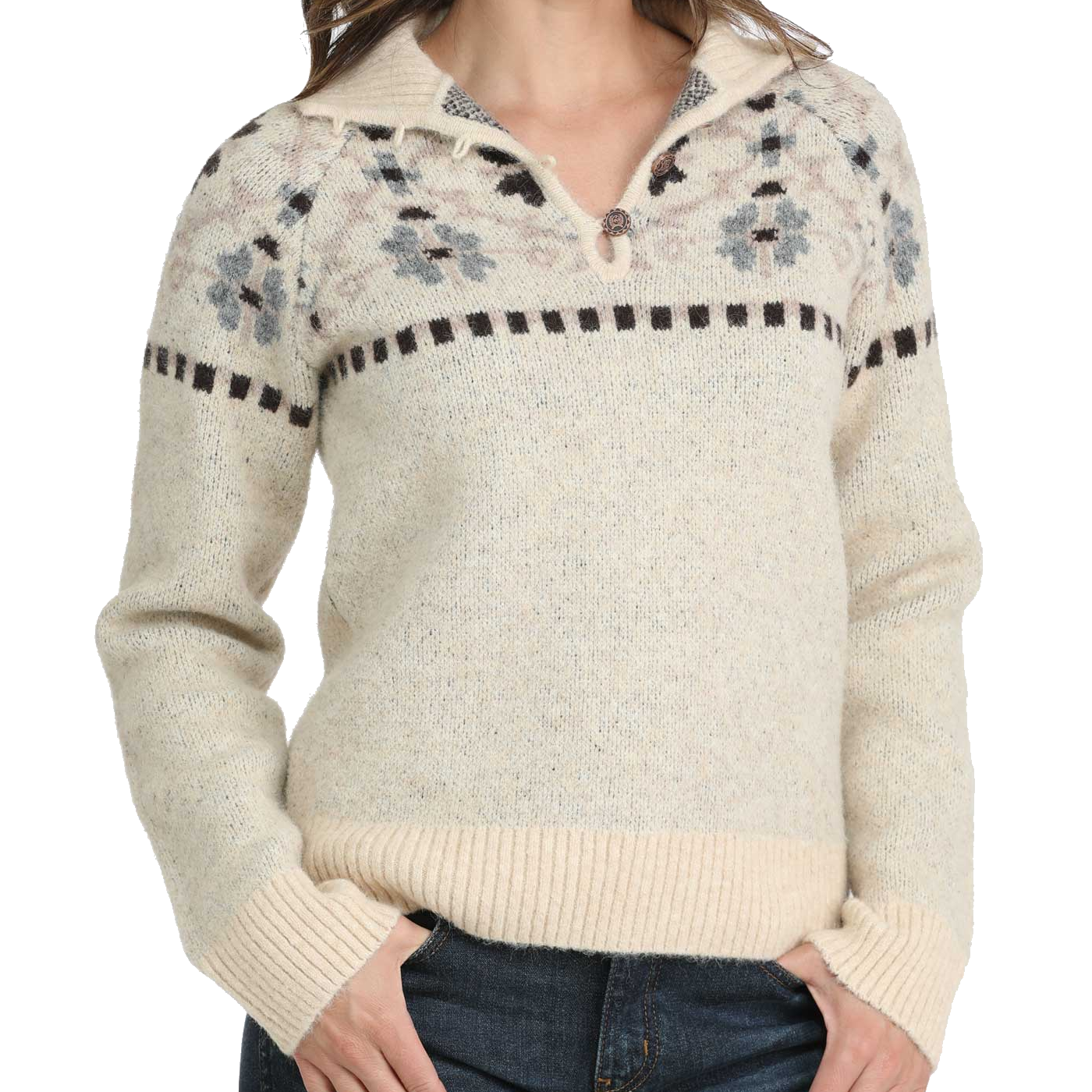 Great new sweater for the season! Stay cozy and fashionable with this new Cream Wool Pullover Sweater. Crafted from soft, durable knit, this sweater offers lasting comfort and a flattering fit. A pretty floral design adorns the shoulders, adding a beautiful touch. The classic button-front design and long sleeves add a touch of timeless style, making it perfect for layering on brisk ranch mornings or pairing with your favorite denim for an effortlessly polished look. A versatile essential that combines warmth, quality, and unmistakable charm. A perfect pair with your favorite button up shirt!