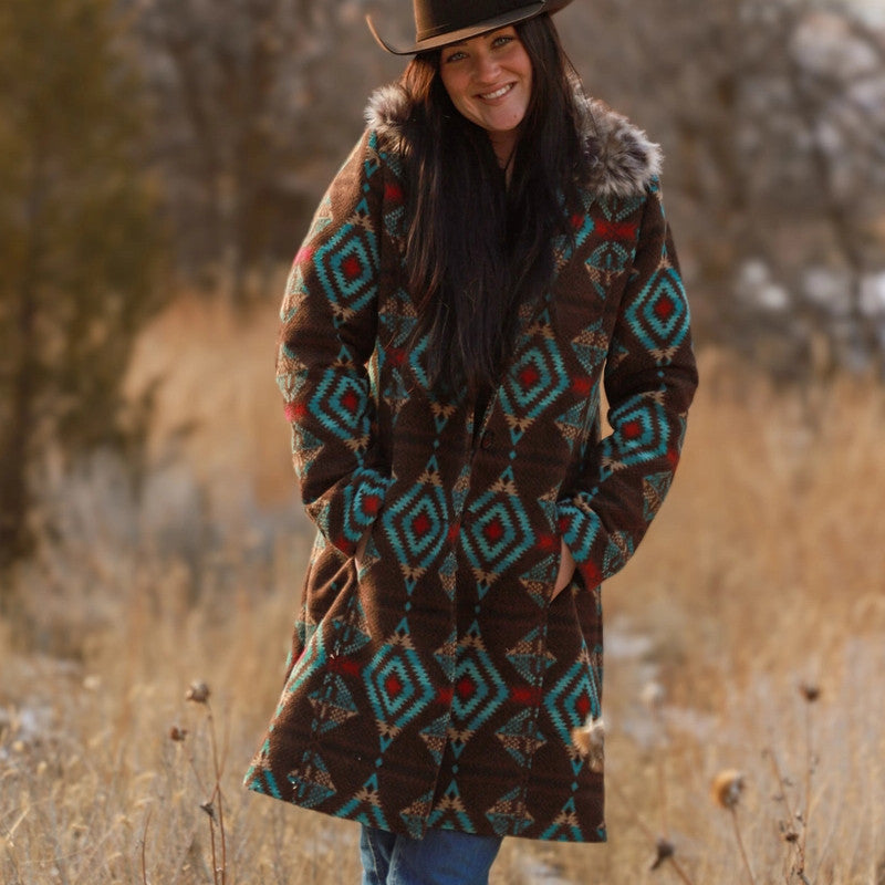 Make a statement with the Women’s Long Aztec Coat, a striking blend of bold patterns and versatile design. Crafted from 100% polyester, this coat features a rich brown base accented with red, tan, and turquoise Aztec-inspired motifs. The removable faux fur collar adds a touch of luxury and versatility, while the five-button front and fully polyester satin lining ensure warmth and comfort. Two side-entry front pockets provide practical storage, making this coat as functional as it is fashionable. Perfect for layering over casual or dressy looks, it’s a standout piece for any wardrobe.