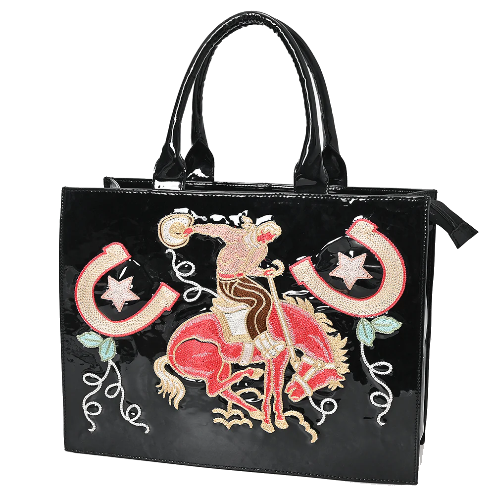 Make a bold Western statement with this eye-catching patent tote, designed to shine wherever you go. Crafted from glossy black faux patent leather, the front features a lively embroidered rodeo scene with a bronc rider surrounded by red horseshoes, classic stars, and scrolling accents. Its structured silhouette and sturdy top handles offer both flair and everyday practicality, perfect for rodeo weekends, travel, or adding a touch of cowgirl glam to your daily style.