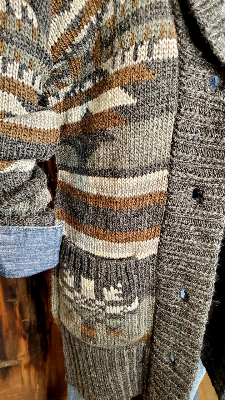 Stay warm and stylish with this Chunky-Knit Shawl Collared Aztec Print Sweater. Ultra-plush and designed for comfort, this sweater combines the cozy appeal of a chunky knit with a bold Aztec print, making it both fashionable and functional. The versatile design allows you to wear it buttoned up or belted at the waist for a polished, flattering winter look. Featured in a beautiful grey and brown color, this sweater will go with anything and will be a perfect addition to your fall and winter wardrobe.