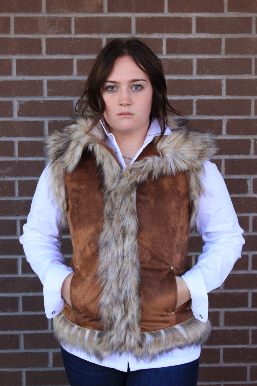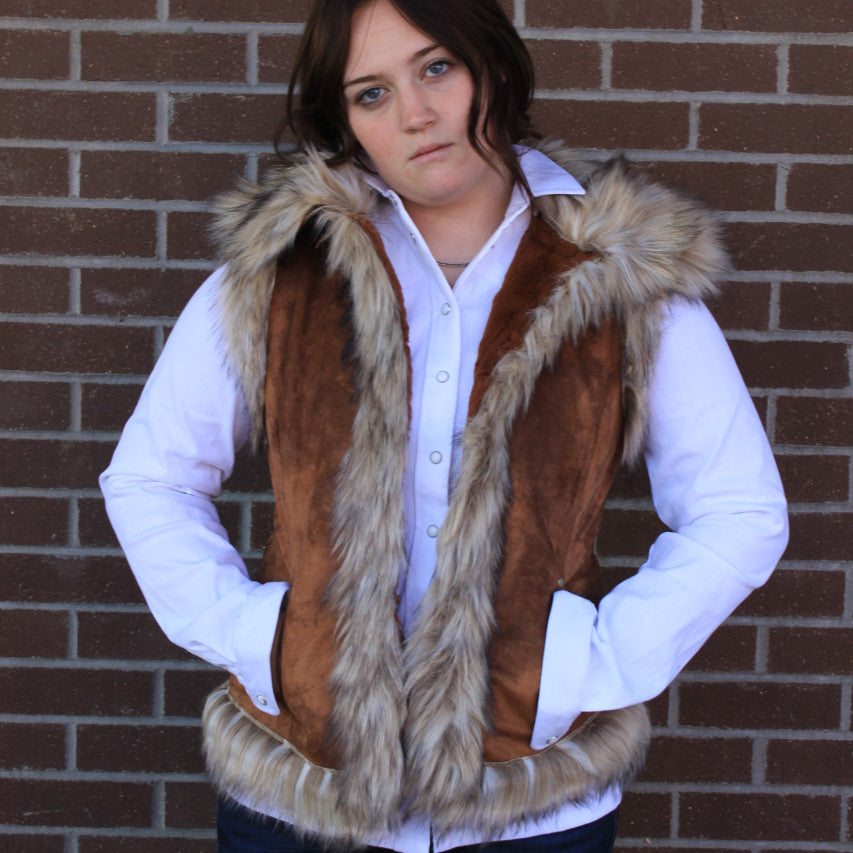 Add a touch of cozy Western flair to your look with this Faux Suede Vest featuring a soft faux fur lining and trim. Designed for both style and comfort, it includes hidden hook closures for a sleek silhouette and easy wear. Crafted from a durable polyester and acrylic blend, this vest is machine washable for effortless care. Perfect for layering, it’s a fun and versatile piece to accessorize your favorite outfits. Add jewelry, belt it, wear it casually over a collared shirt or over your favorite mesh top.