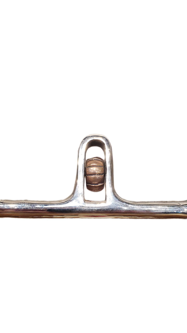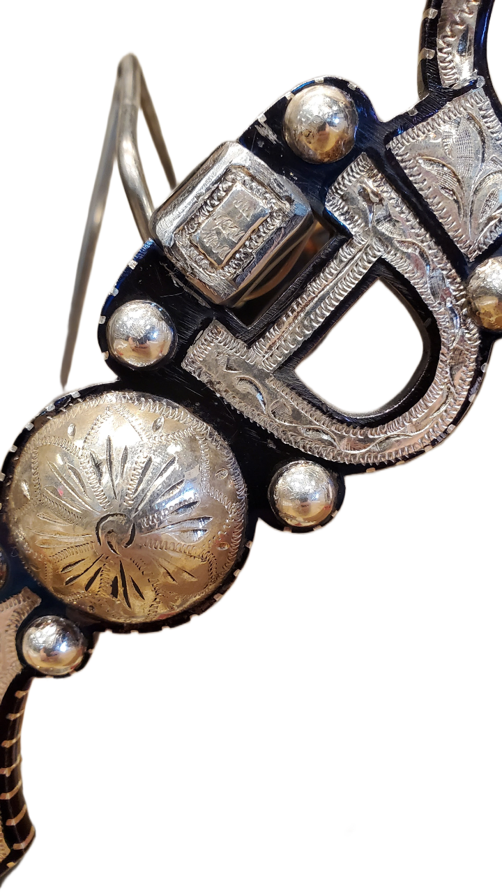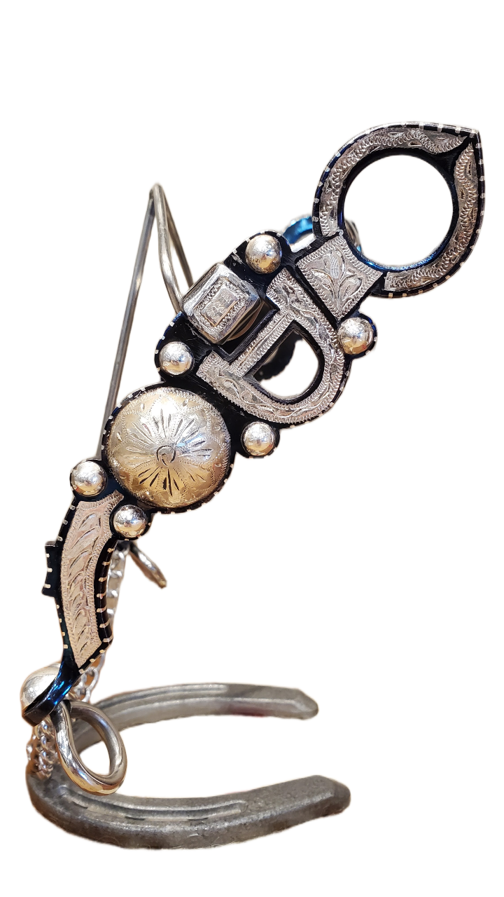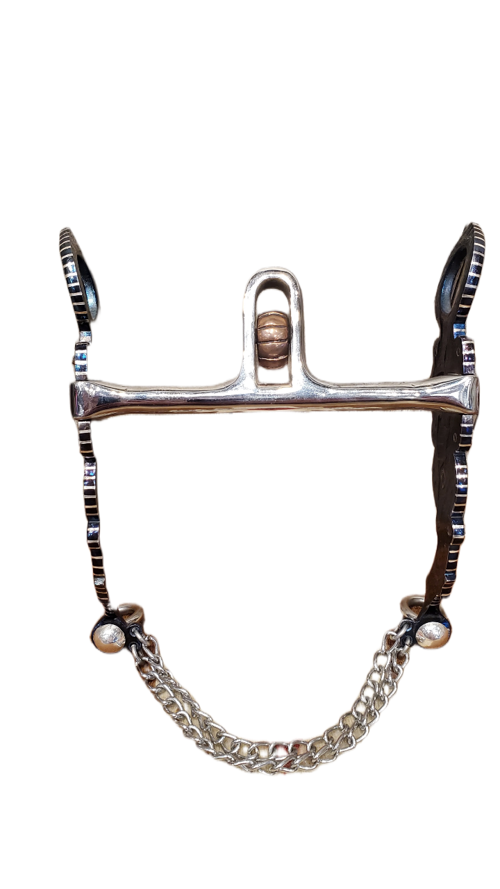 Hand-made, hand-engraved Blue Steel Bridle Bit. Sterling inlaid Santa Susanna Cheek. Traditional Half Breed Mouth with Copper Roller. 7" cheeks, 5 1/4" mouth. Slobber Chains.
