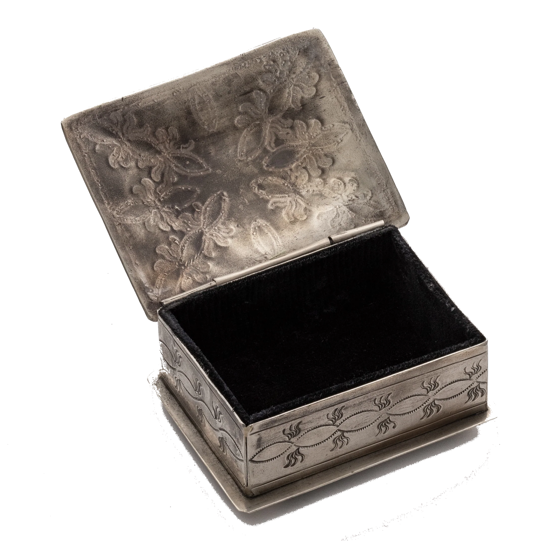 A Best Seller! Hand-stamped, hand-made German Silver Small Stamped Box with Turquoise Stone. 4 1/4" x 3 1/4" x 2 1/2". Hinged top reveals black velvet lined box which is perfect for jewelry or other keepsakes.