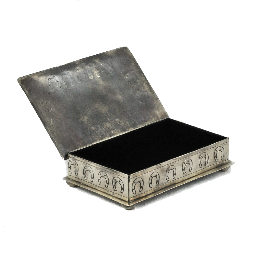 Featuring stylized horseshoes, the Horseshoe Stamped Box with turquoise accents is a true testament to Southwestern craftsmanship. Hand-tooled by skilled artisans, this piece showcases a vintage-style finish that exudes authenticity and timeless charm. Lined with soft velvet, it offers both elegance and function—perfect for safeguarding cherished keepsakes. Whether displayed on a dresser, desk, or coffee table, this decorative box brings a touch of rustic allure to any room and makes a thoughtful, artful gift.