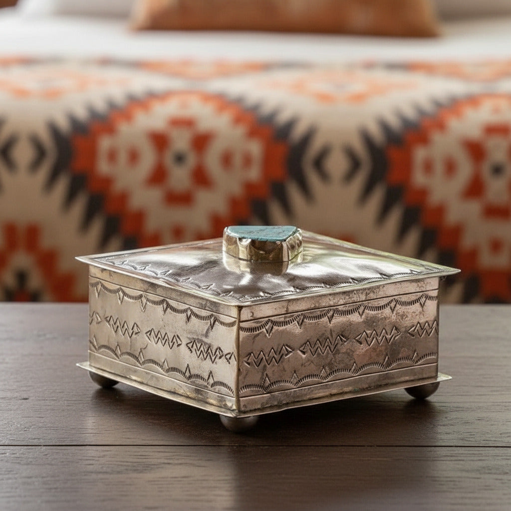 A wonderful gift idea! This box is meticulously hand-tooled by skilled artisans using age-old techniques, ensuring that no two boxes are exactly alike. Crafted from nickel silver with a vintage-style finish and darkened accents for depth and character, this box is adorned with a hand-selected turquoise slab sourced from Dallas. Inspired by the artistry of classic Navajo silversmiths, it serves as both a functional storage piece and a timeless decorative accent.